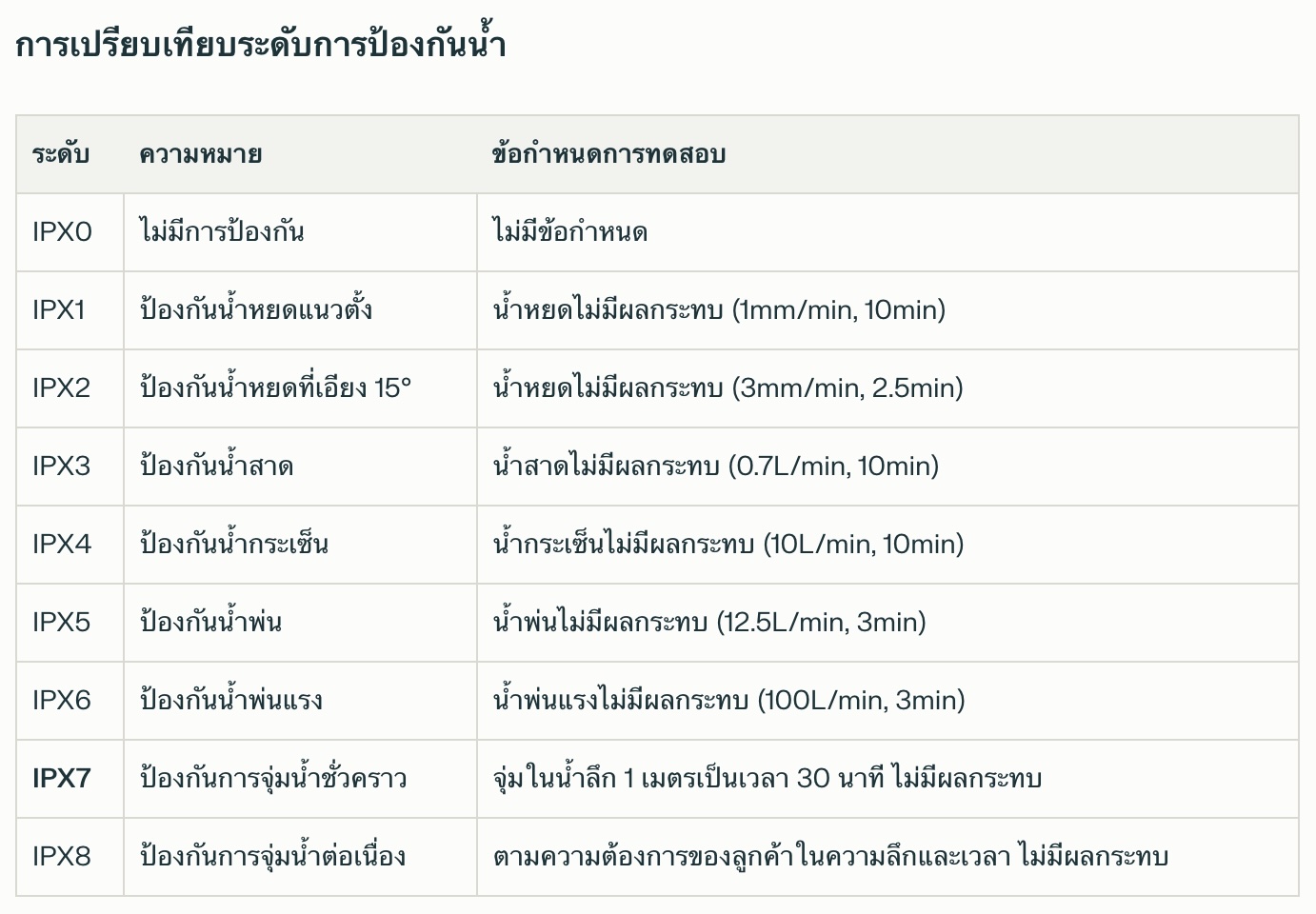 - เงื่อนไขการทดสอบ: อุปกรณ์จะต้องถูกจุ่มในน้ำที่ระดับความลึก 1 เมตร